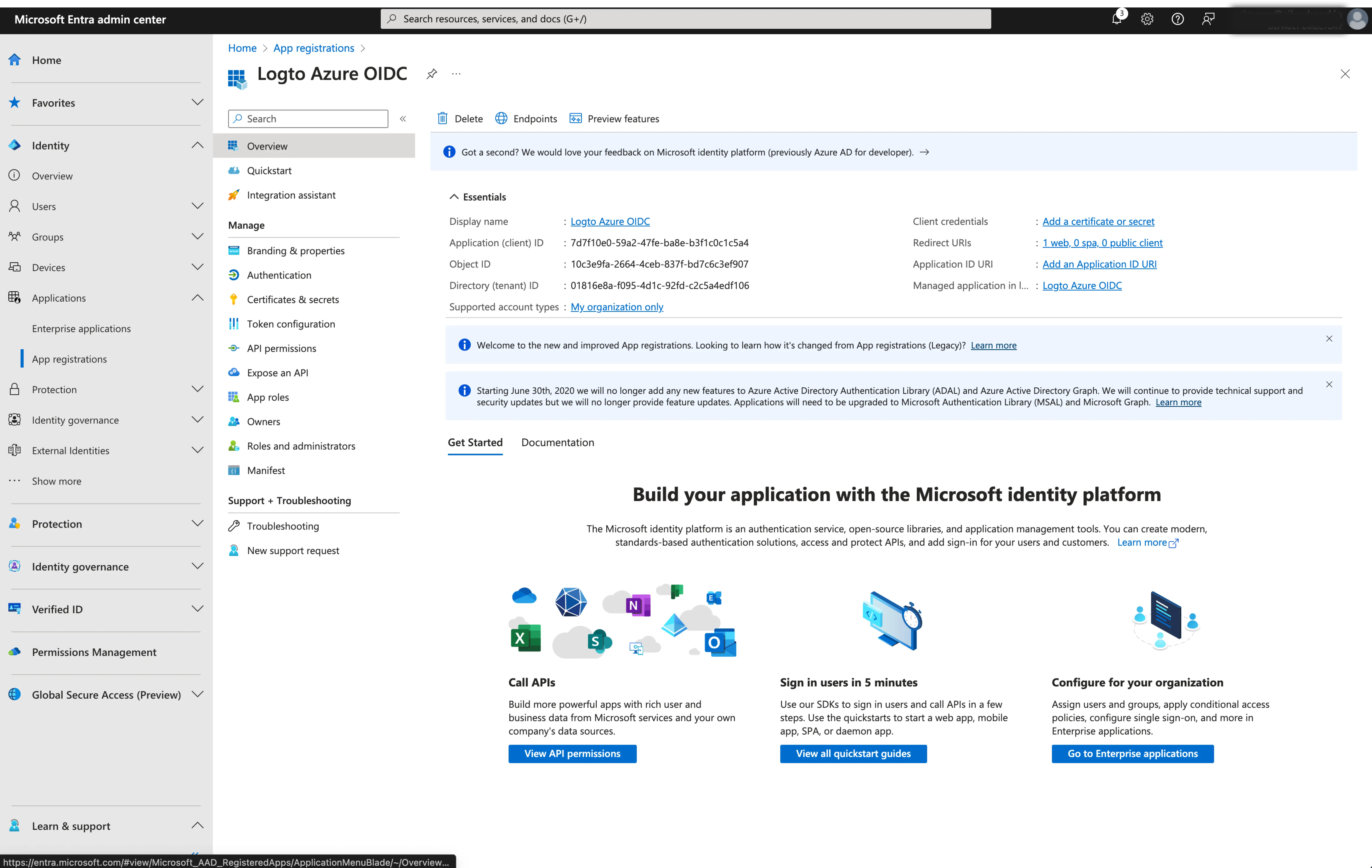 1. Client ID: A unique identifier assigned to your OIDC application by the Microsoft Entra. This identifier is used by Logto to identify and authenticate the application during the OIDC flow. You can find it in the application overview page as Application (client) ID.