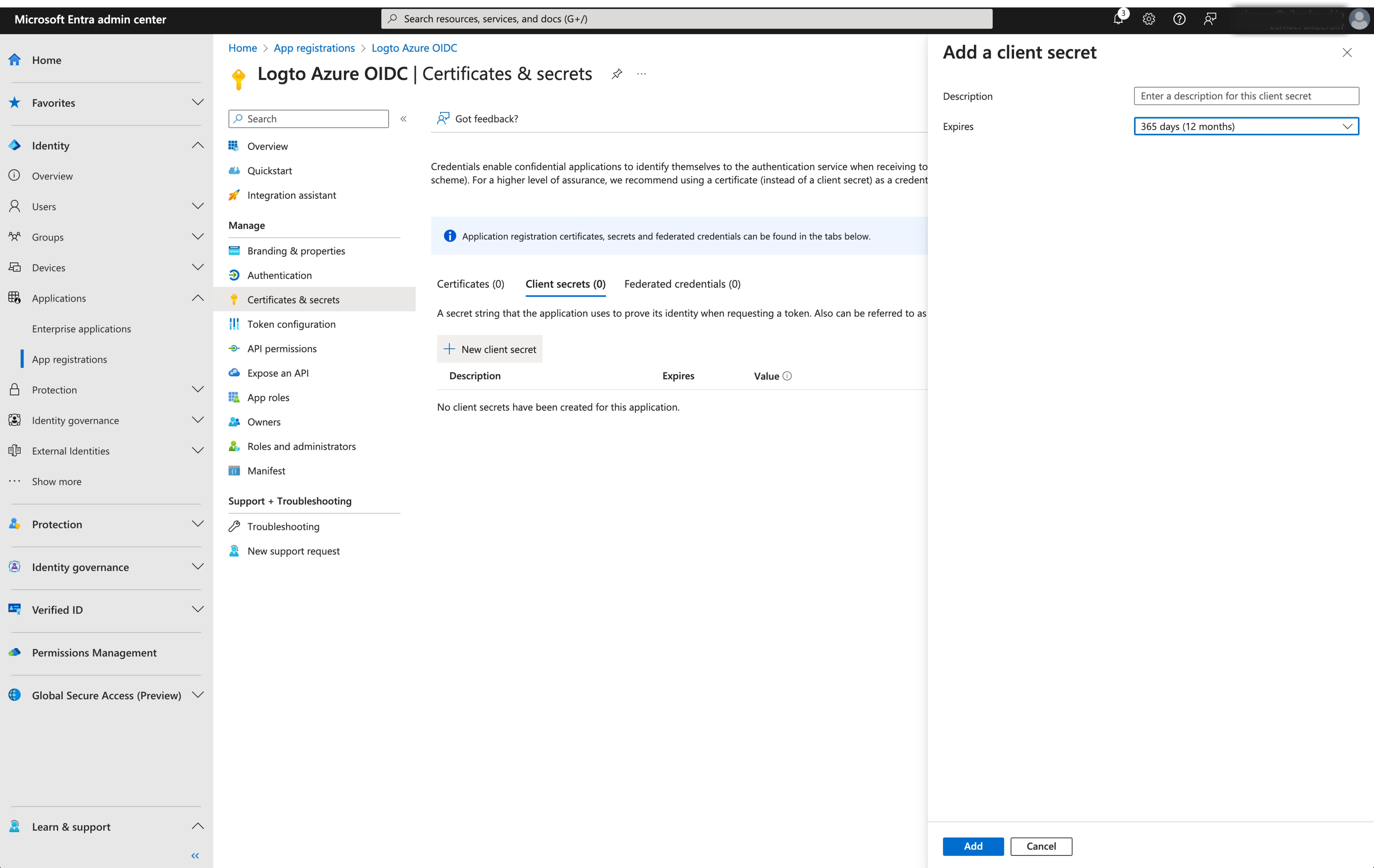 1. Client Secret: Create a new client secret and copy the value to Logto. This secret is used to authenticate the OIDC application and secure the communication between Logto and the IdP.