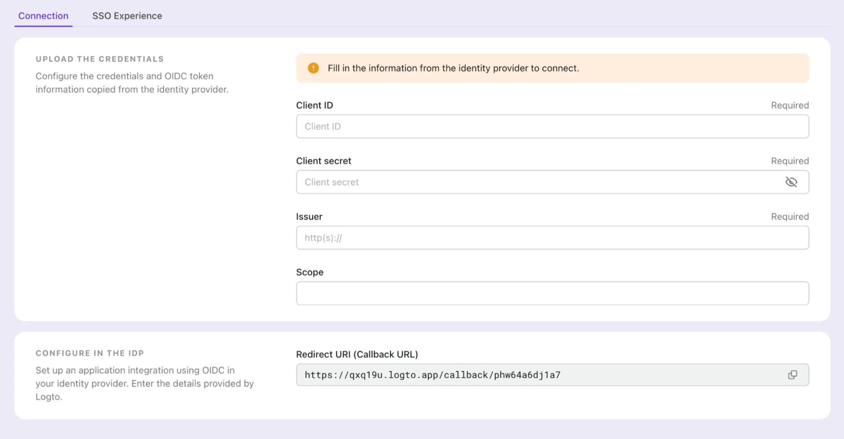 1. Scope (Optional): Logto automatically includes the required scopes (openid, profile, and email) in all requests. You can specify additional scopes as a space-separated list if your application requires extra permissions or access levels from the IdP.