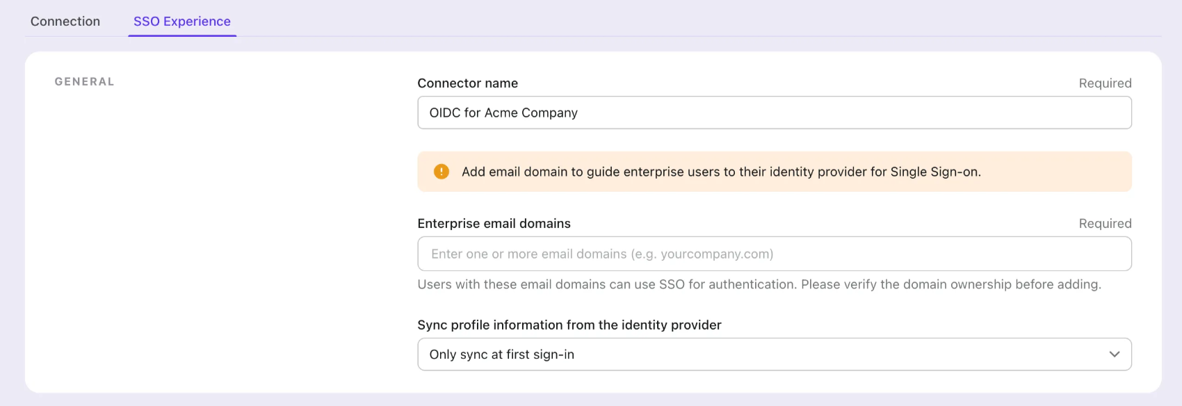 Users with email addresses in the specified domains will be exclusively limited to use your SSO connector as their only authentication method.